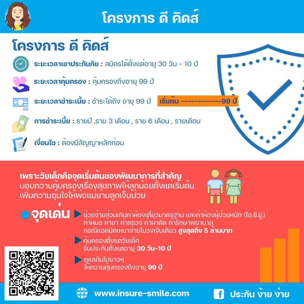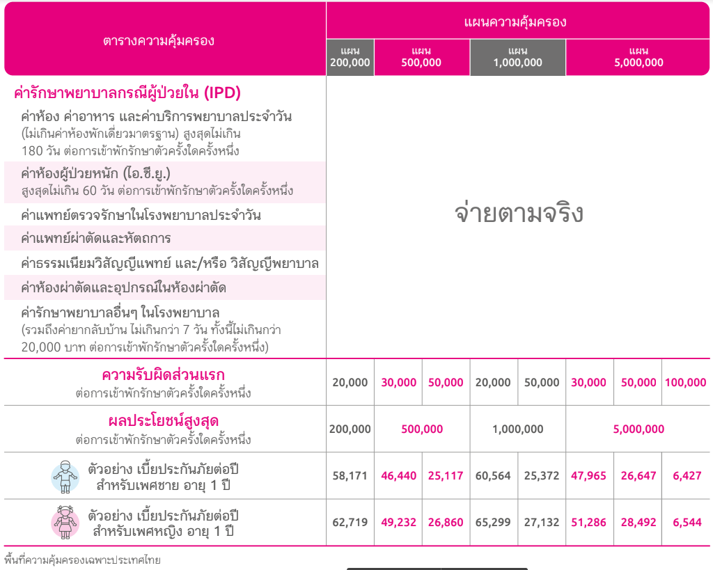 อายุ 30 วัน - 10 ปี ดูแลยาวถึงอายุ 99 ปี เลือกใช้สิทธิ์ convertible เหมาจ่ายวงเงินเดียว แอดมิทได้ทุก รพ. คุ้มครองตั้งแต่วัยเด็ก