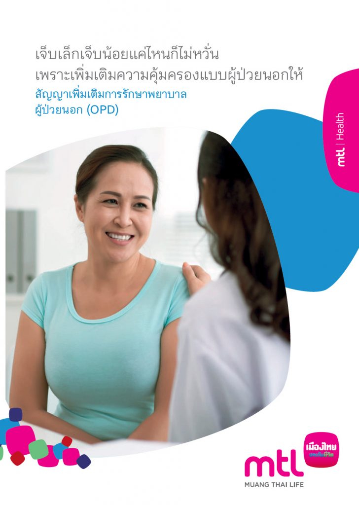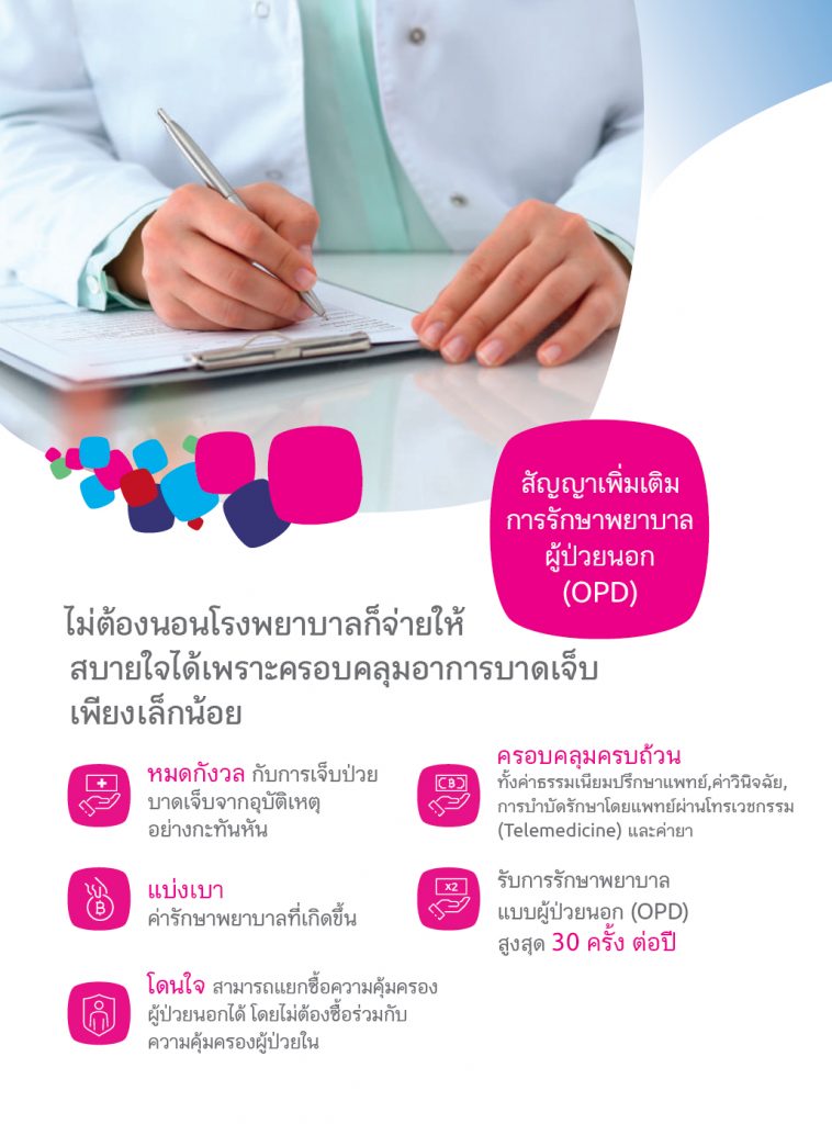 เจ็บป่วยหรือเกิดอุบัติเหตุ ก็มั่นใจ เพราะสัญญาเพิ่มเติม การรักษาพยาบาลผู้ป่วยนอก (OPD) จากเมืองไทยประกันชีวิต ก็คุ้มครอง พร้อมช่วยแบ่งเบาค่ารักษาในกรณีผู้ป่วยนอก (OPD) ทั้งค่าธรรมเนียมปรึกษาแพทย์ ค่าวินิจฉัย และค่ายา สูงสุด 30 ครั้ง ต่อปี สมัครได้ตั้งแต่ อายุ 6 ปี – 80 ปี ดูแลยาวถึงอายุ 99 ปี